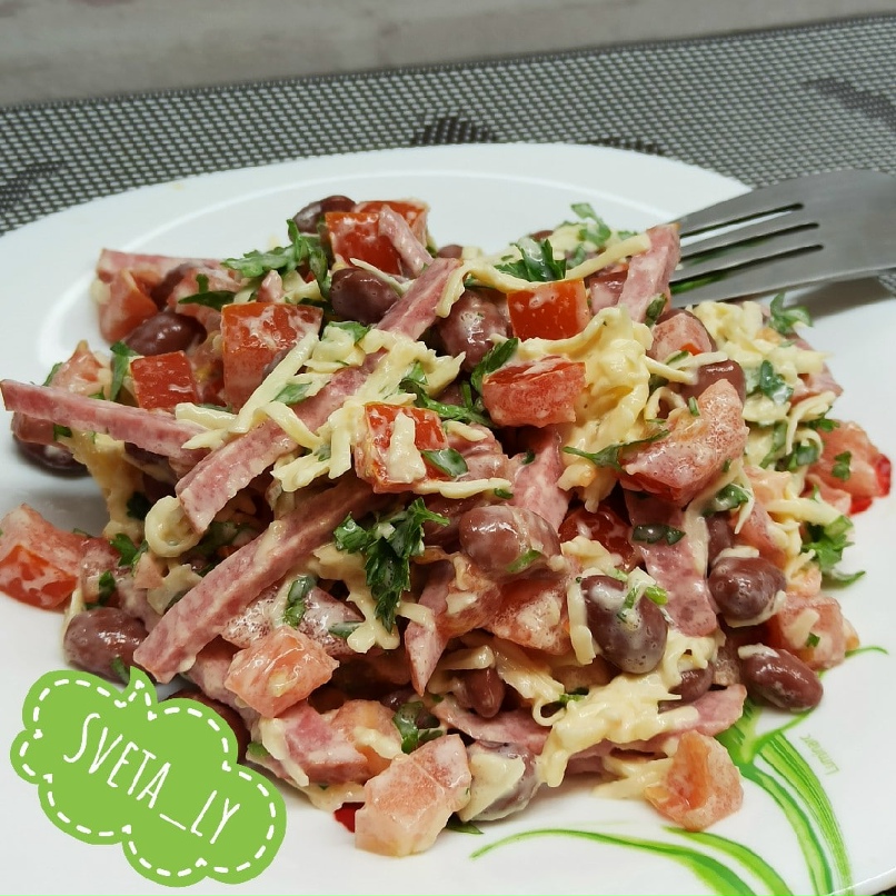 Вкусные рецепты: Салат Обжорка с фасолью и копченой колбасой